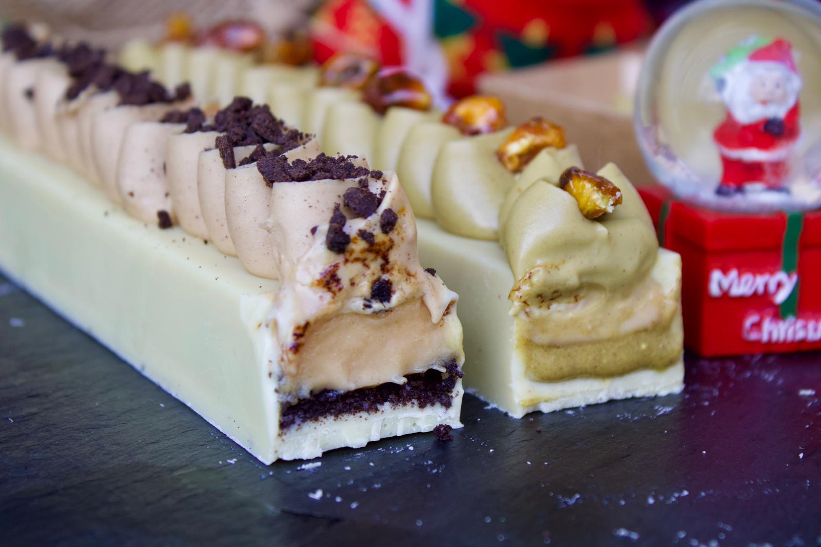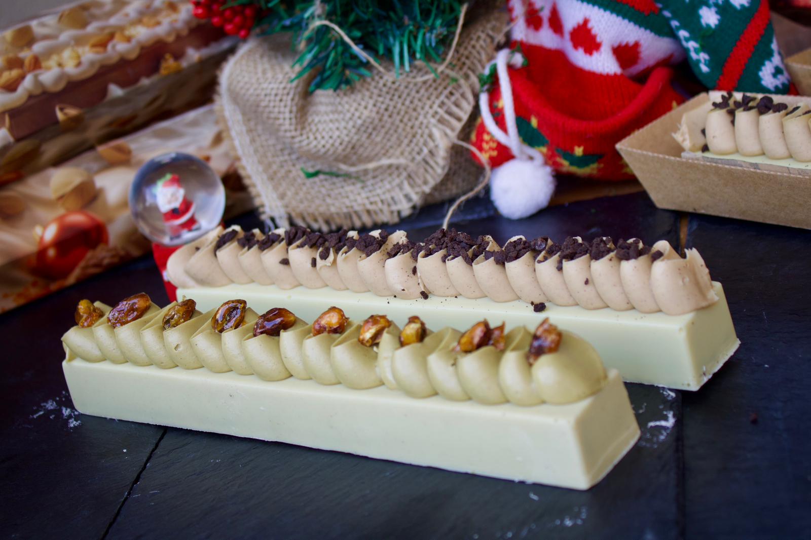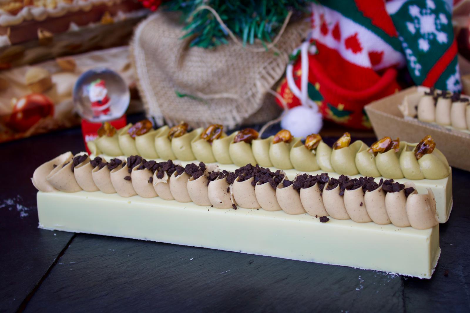 Estructura de pistacho y chocolate blanco con una cremosa capa de pistacho, relleno de butter cookies y un exquisito praliné de pistacho ibérico. Elegante, aromático y con un sabor profundo pensado para los amantes del pistacho.